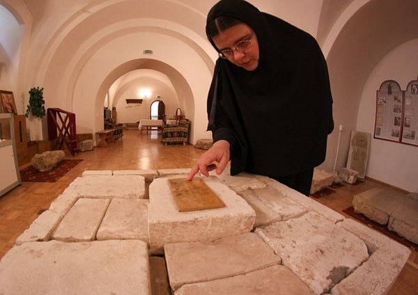 В монастырском музее. Мать Илария показывает закладной камень собора, который освящал святитель Филарет, митрополит Московский.