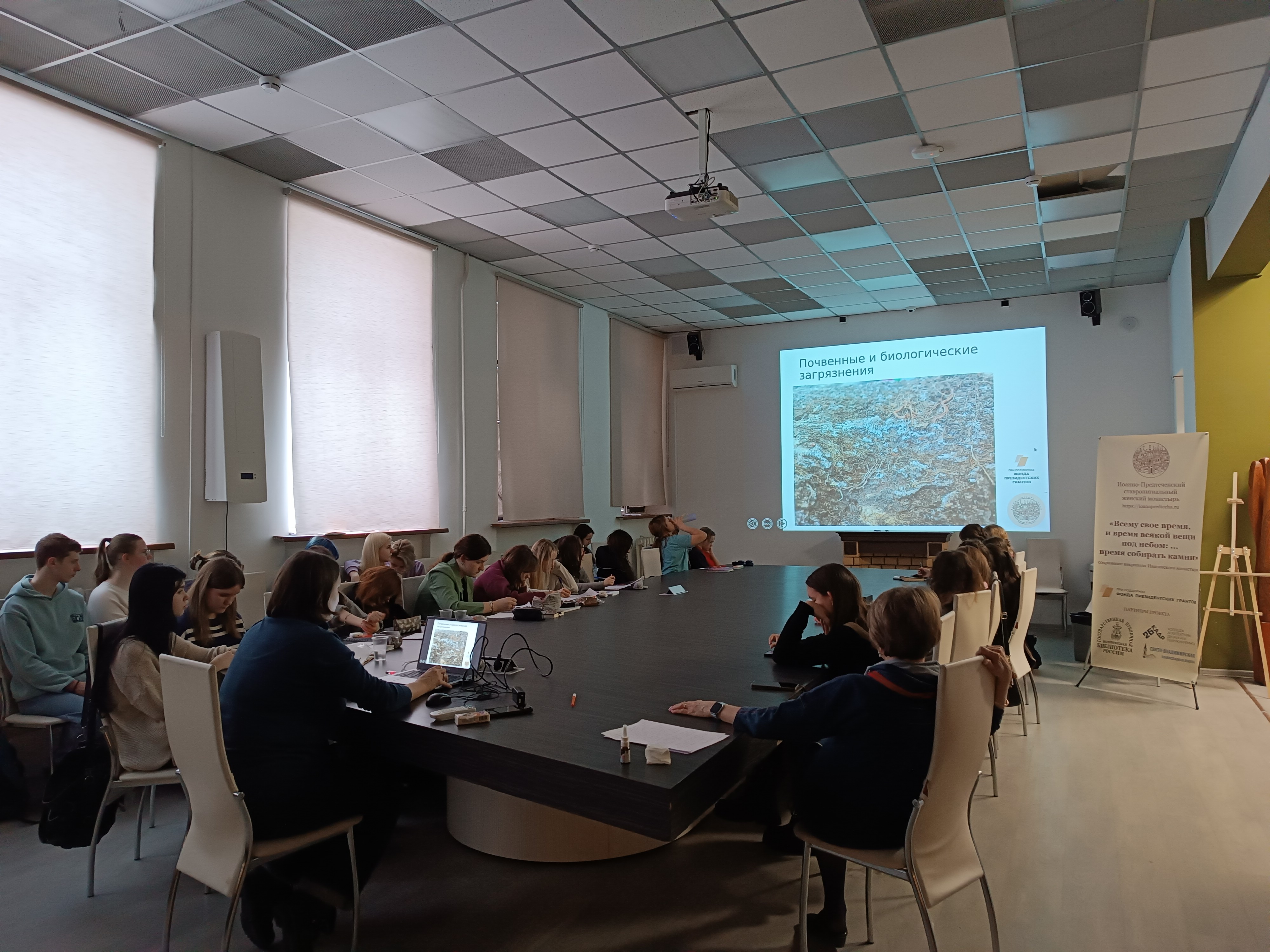 Затем 26 февраля на территории колледжа руководитель реставрационного направления проекта художник-реставратор, ученый секретарь Государственного НИИ реставрации Анастасия Сергеевна Макарова провела первое занятие для группы будущих волонтеров по подготовке их к работам с объектами некрополя. Отрадно видеть живой интерес к истории нашего монастыря и отклик будущих реставраторов на предложение участия в проекте, который реализуется при поддержке Фонда президентских грантов.